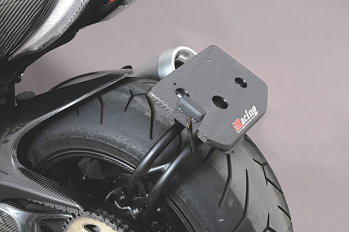 ナンバーを上方に移動し、ワイドタイヤの迫力を強調させるために開発されたナンバープレートオフセットステー。