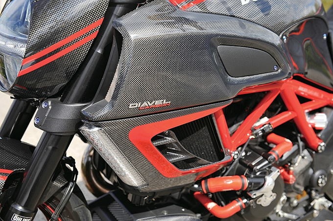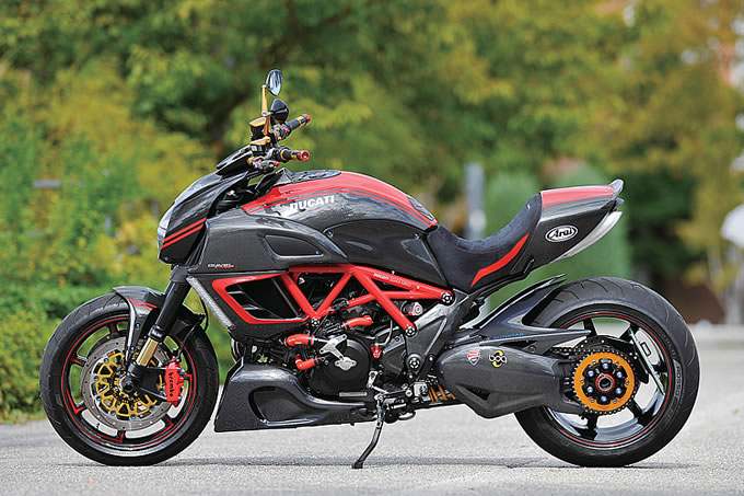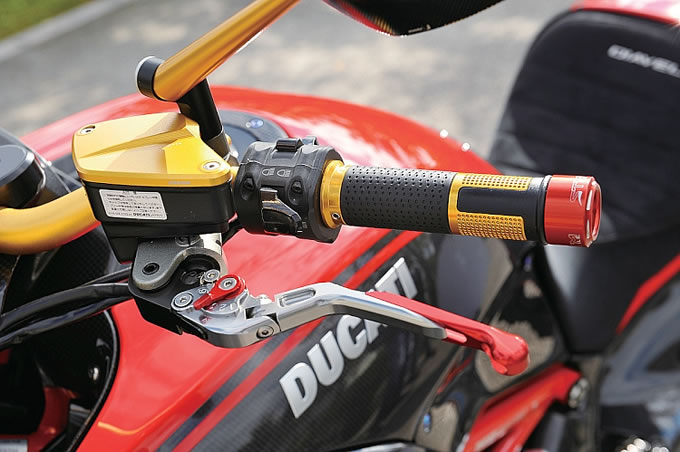 また足まわり、ボディ、グリップエンドなどに、赤を配色。ラグジーかつスポーティなカスタムスタイルを完成させている。このディアベル、オーナーが使わない時にはドゥカティ大阪箕面に展示されているから、興味ある読者は足を運んでみてはいかがだろう。