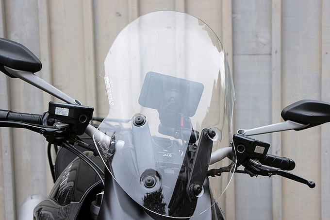 カーボンの エアダクトカバー はマジカルレーシング。スクリーンはディアベルストラーダ用の純正品、快適性が大きく向上した。