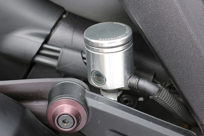 ヘッドライトカバーの上に ETC を装着しているが、取付けステーはやはり自作品。リゾマの リアブレーキリザーバータンク とアエラの クラッチレリーズ は、純正品の形が気に入らないという理由で交換したという。自作のキャリアはスチール。ディアベルに似合うように、曲線を基調にデザインされている。サイドケース はヘプコ&ベッカー。