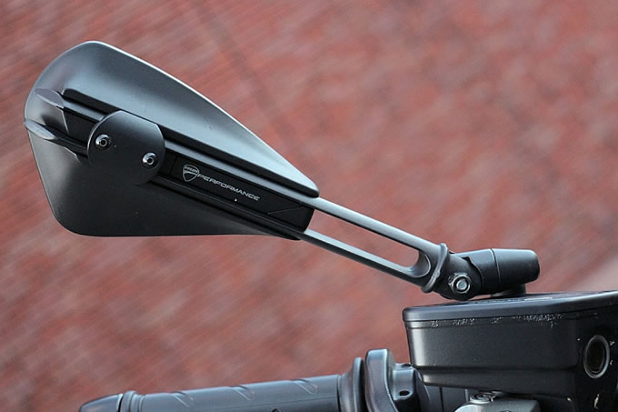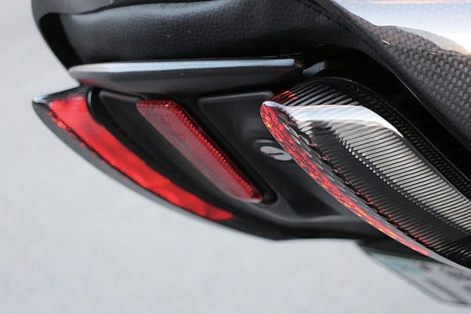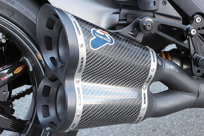 スモークタイプのウインカーレンズは、既製品ではなくペイントしたもの。エクステリアパーツはドゥカティパフォーマンスで統一。マフラーもドゥカティパフォーマンスの専用 ECU 付属のテルミニョーニ。シートはディアベルストラーダ用。