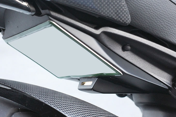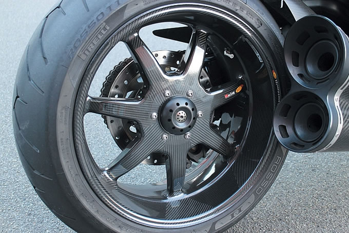 ナンバープレートベースはワンオフ。このベースプレートやスモークウインカーレンズに、四輪でのノウハウが活かされている。BST のカーボンホイールは、マフラーが短くなりホイールが目立つようになったので、よりホイールを強調しようと装着。