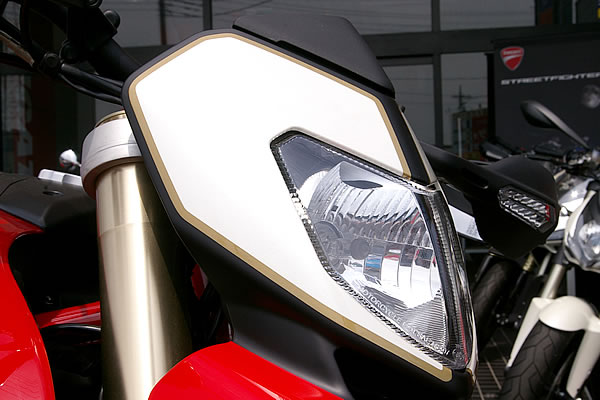 ハイパーモタードの精かんなフロントマスクはゼッケン風に塗り分けられ、往年のレーサーのような雰囲気を演出。