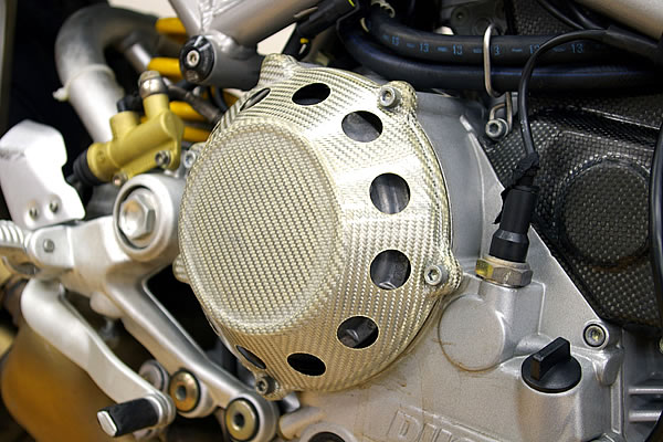 定番のクラッチカバーは一工夫してシルバーカーボンをセレクト。こういった積み重ねがカスタムの完成度を高める。