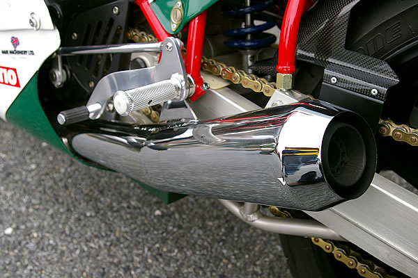 マフラーはハリス製のレーシーなスタイルのものへと変更されている。ルックス、サウンドともカスタム内容に見合ったアイテムと言えるだろう。