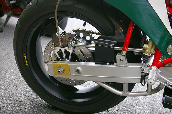 リアのブレーキもブレンボをセレクト。スイングアームは補強が入ったものへと変更済み。仕上がりの美しさにも注目だ。