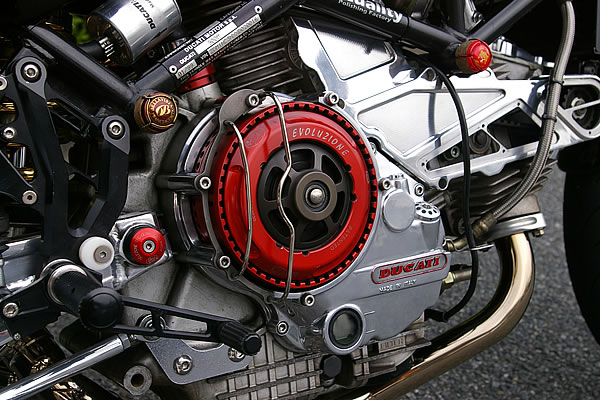 クラッチはSTM製のスリッパークラッチに交換。エンジンブレーキを低減し、リアタイヤのホッピングを抑えてくれる。