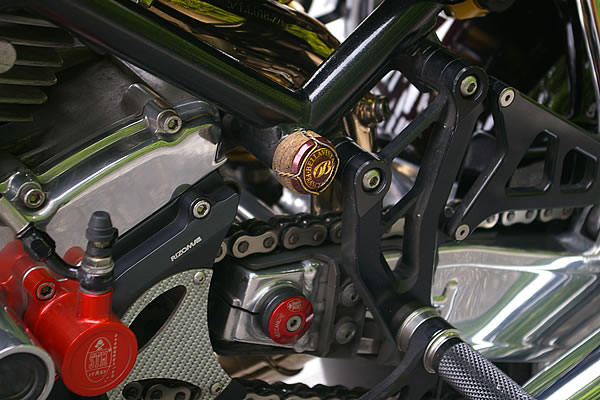 ボディカラーは一見黒に見えるが、光の加減で赤が浮き上がるこだわりのオリジナルペイント。メッキパーツの配分やカラーセレクトにも並みならぬセンスがうかがえる。ドゥカティスティにとって定番とも言えるフレームキャップには、シャンパンなどのコルクを使うという素晴らしいアイデアを採用しているのも興味深い。ここまで完成されたモンスターは、なかなかお目にかかることは出来ないだろう。