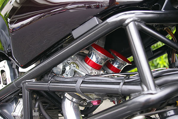 吸気系はTMRキャブレターに換装。エアボックスを廃してファンネル仕様に変更しており、吸気効率を徹底的に追求している。
