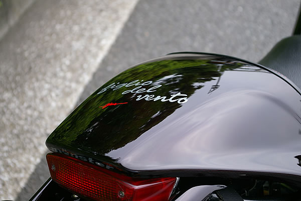 オリジナルペイントは複雑な色合いとなっている。リアカウルの「figlio del vento」の文字は「風の子供」という意味とのこと。