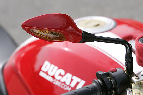 ウィンカーをビルドインするFAR製ミラー。FARはドゥカティ本社と同じボローニャに本社を置く二輪ミラー専門メーカーで、実に豊富な形状のミラーを開発している。