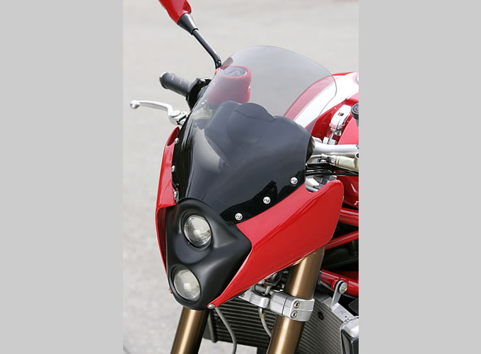 前回に続いて、今回もドゥカティ神戸によるカスタム実例を紹介しよう。すでに一世代前になってしまったモンスターがベースだが、特徴ある顔つきのロードレーシング製フロントカウル(販売=ガルーダ)を使い、個性を演出するとともにモンスターが持つ非日常的なパワーと存在感をいっそう強調している。FAR製のシャープなスタイルを持つミラー(販売=KMA)、ライディングハウス製カーボンクラッチカバー、ファストバイフェラッチ製のプレッシャープレート(販売=デスモ)、アエラ製ステップ、アルト製ローター(販売=モトコルセ)と、ドゥカティをカスタマイズするなら欠かせないメーカーのパーツをうまく使い分けている。シルモーター製カーボンマフラーは、国内での認知度は低く正規取扱店がない状況だが、海外ではメジャーなマフラーだ。