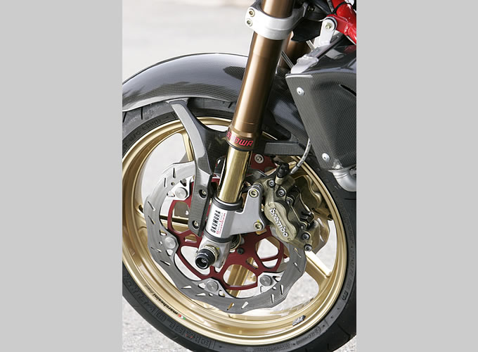花弁型のフロントディスクローターはアルト製。なめらかなカーブを描くアウトラインは、フロントホイールの真円と好対照となって、その美しさを優雅に主張する。