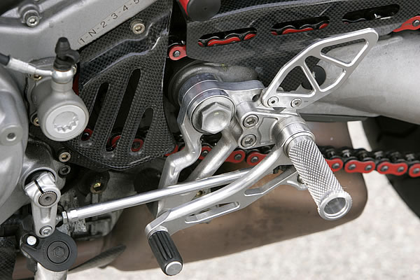 アエラ製のライディングステップキットは、10~20mmの範囲で上下左右に位置調節が可能となっており、ベストポジションをキープしたライディングを実現する。