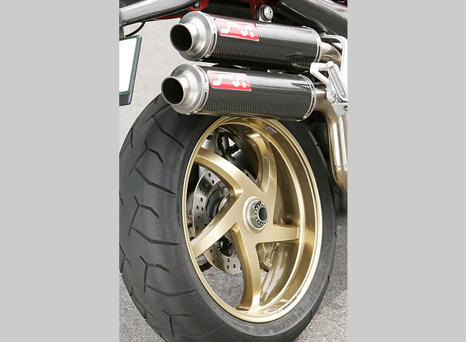 海外では有名なシルモーター製マフラー。ホイールは純正ながらゴールドカラーに粉体塗装しており、車両全体の印象をガラリと変えることに貢献している。