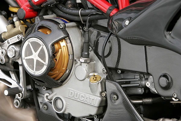 ライディングハウス製クラッチカバーは、カーボンとアルミを組み合わせたハイブリッド仕様。個性的なスタイルがこのカスタマイズのコンセプトと同化している。