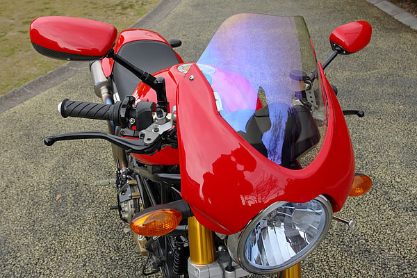 ノーマルより5cm高いSPEED製エアロスクリーンは、チタンコートバージョン(27,300円)を装着。