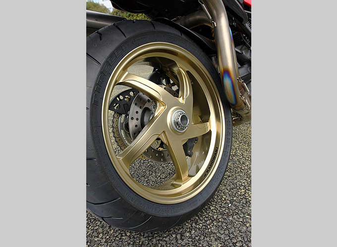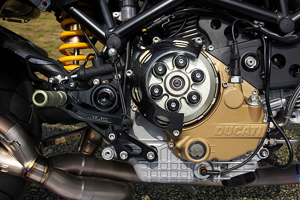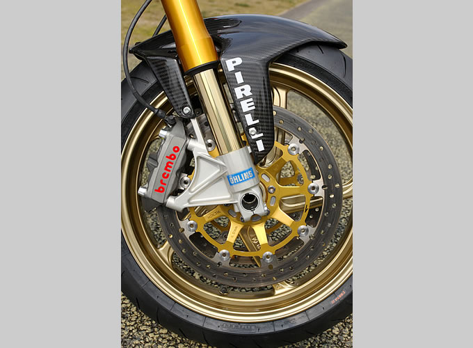 オーリンズ製フロントフォークとブレンボ製モノブロックキャリパーは、1098Sの純正部品を流用。マスターシリンダーも同様に1098Sの純正流用だ。