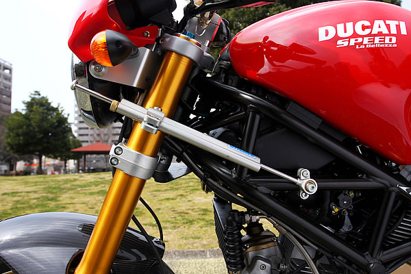 オーリンズ製ステアリングダンパーを車体左側に装着。ライディングの安定性を高めるのはもちろんのこと車体のアクセントとしても貢献している。