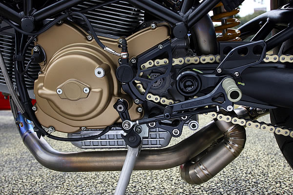 このモンスターのフレームはレッド、スイングアームはシルバーがスタンダードだが、それらをブラックで統一。さらに“S”に近づけるべく前後サスをオーリンズ製にしている。