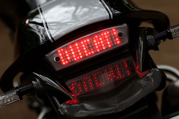 通常点灯時には「DUCATI」と浮かび上がるLEDテールランプ。ブレーキ時にはすべてのLEDが点灯する。イタリアの無名メーカー製らしいが、この手の部品は本国にはたくさんあるのだという。