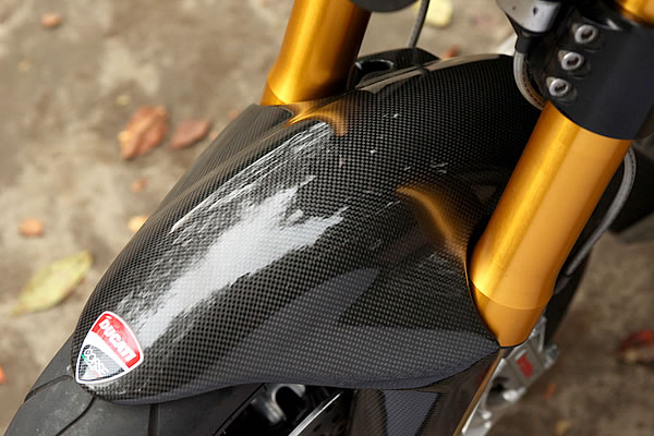 フロントフェンダーはリアのインナーフェンダーと共にカーボン製。クランティさんは、主に本国のモンスター関連WEBサイトでパーツ情報を入手し、ネット通販などで購入することが多いらしい。