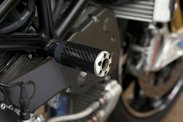 フレームスライダーはカーボン柄でアルミキャップ付き。地味なアイテムではあるが、万が一の際のプロテクション効果は絶大だ。大の走り好きというクランティさんにとっては必需品なのだ。
