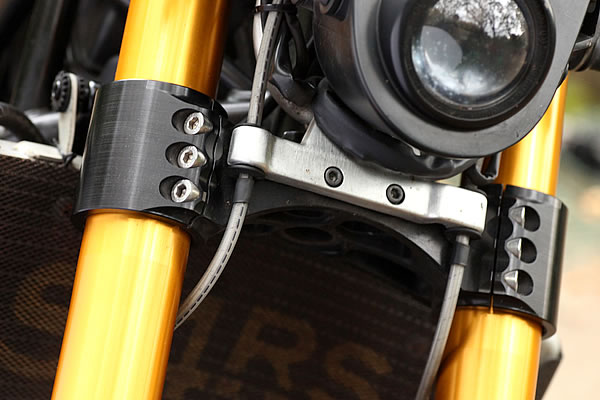 トップブリッジ、ステムシャフト、アンダーブラケットはイタリア・CNC製。アルミを削り出した後に、ブラックアルマイト加工が施されている。質感も非常に高く、カスタムムード満点の逸品だ。