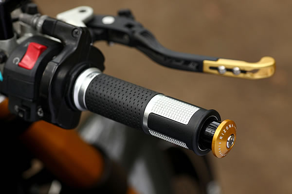 クランティさんが好んで採用しているイタリアのRIZOMA製パーツ。グリップとグリップエンドも同社製だ。とくにグリップはラバーとアルミのハイブリッドで、遊び心と高い質感に溢れる仕様である。