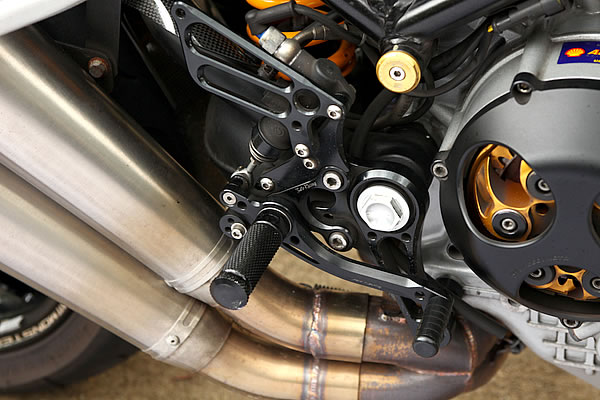 唯一といっていい日本製パーツが、Sato Racing製のバックステップ(大阪Baby Faceの海外ブランド名)だ。黒/金のカラーコーデを重視するために、あえてブラックアルマイトをチョイス。