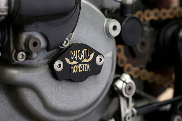 本国のモンスターファンサイトで業者を見つけ、オーダーしたというエンジンキャップには、クランティさんがデザインしたモチーフが刻まれる。同じマークは愛用のヘルメットにもある。