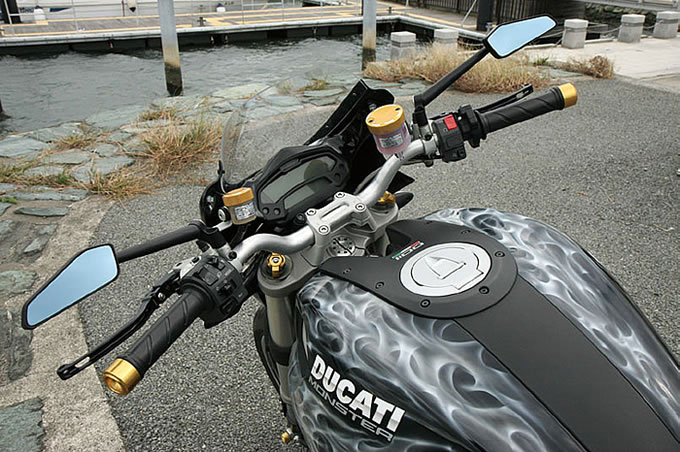 ライダースクラブ製のバーハンドルに、STM製のアルミビレッドフルードタンクや、バーエンドを装着。ゴールドカラーが全体のアクセントになっている。