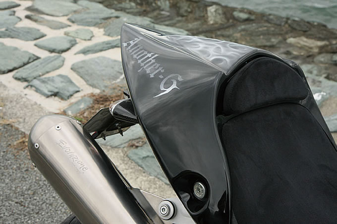 シートカウルはオリジナル形状をしたワンオフもの。ライディングハウス製のショートテールキットとの併用により、かなりシャープな印象を受ける。