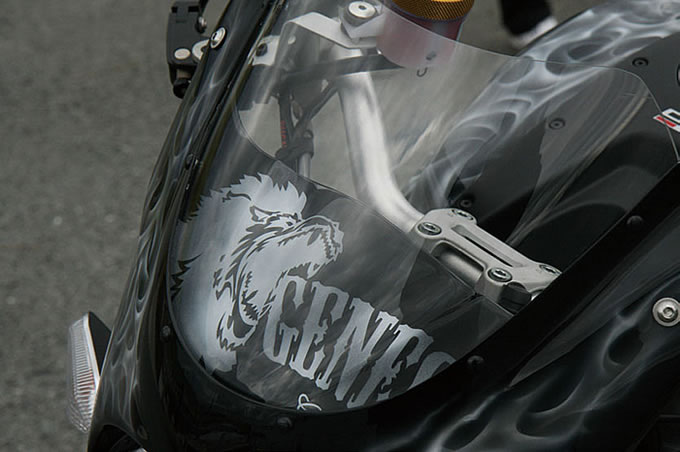 フロントマスクは、ディライト製のビキニカウルをベースに、形状を変更。スクリーンの内側にもカスタムペイントにてオリジナルロゴをあしらっている。
