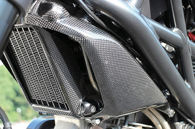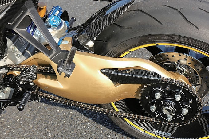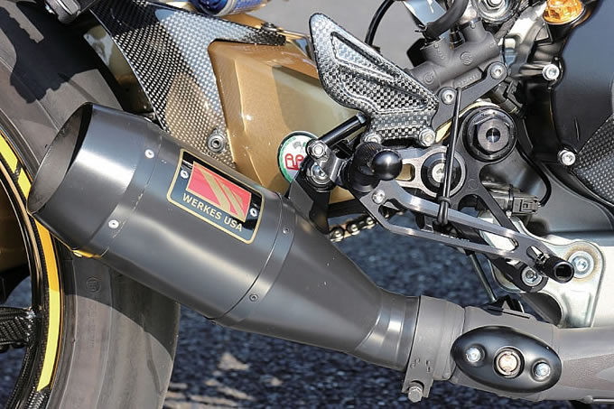 カーボンパーツはドゥカティパフォーマンスと、アメリカの Tekarbon が中心。ハンドルまわり のパーツは、ゲイルスピードとリゾマを使用。前後ブレーキローターはブレーキテック。オイルクーラー周辺のカーボンパーツも Tekarbon。インテークエアの整流効果も狙う。また MWR パワーアップキットも装着された。マフラーはアメリカの Werks。リアサスはイタリアの RAM マグネシウムスイングアームに FG リアショックの組み合わせ。カーボンホイールは BST。リムテープも Good。