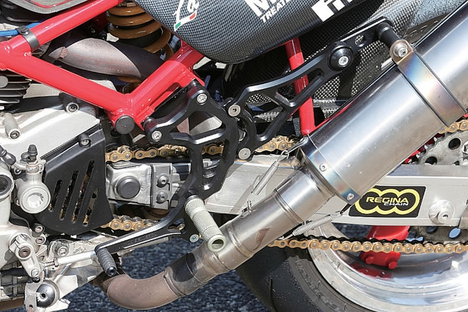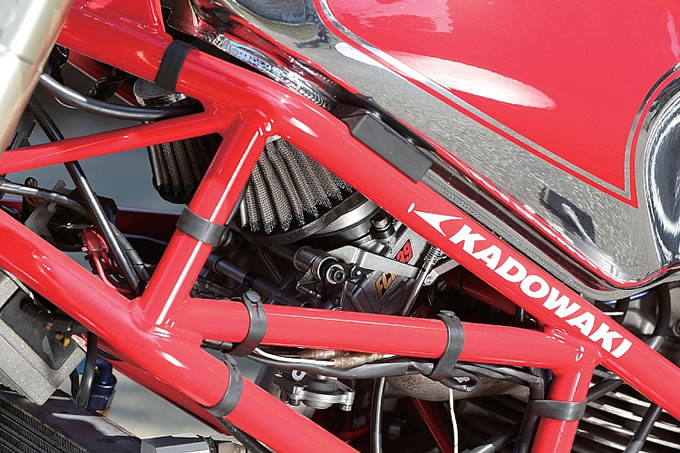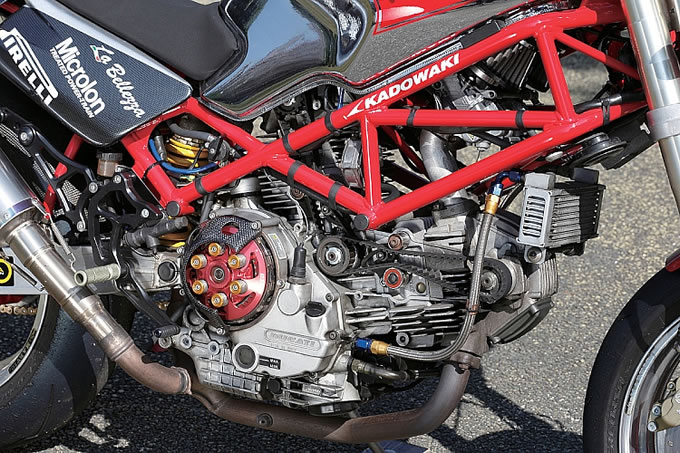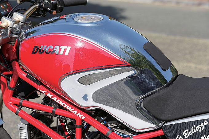 フレームはカドワキコーティングの手により、耐久性に優れるパウダーコートでリペイント。タンクは モンスター900クロモ のメッキタンクにペイントを加えてイメージを一新させている。エンジンはノーマルだが、キャブレター はケーヒンの FCR 39mm に変更。マフラーはラベレッツァのオリジナルパーツブランド SPEED のスリップオンを加工し、テールアップスタイルにして装着している。ホイールは前後ともにアクロン・マービック。クラッチカバーやプレッシャープレートも SPEED を使用している。
