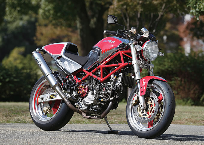ドゥカティらしいレッドと、メッキやポリッシュの金属的な輝きが鮮烈なコントラストを生んでいるモンスター。このマシンを製作したのは、熊本のラベレッツァ。ドゥカティでの鈴鹿8耐参戦では草分け的存在であり、レースイメージの強い同店だが、実はストリートカスタムも大の得意。このモンスターもそうして作られた一台だ。