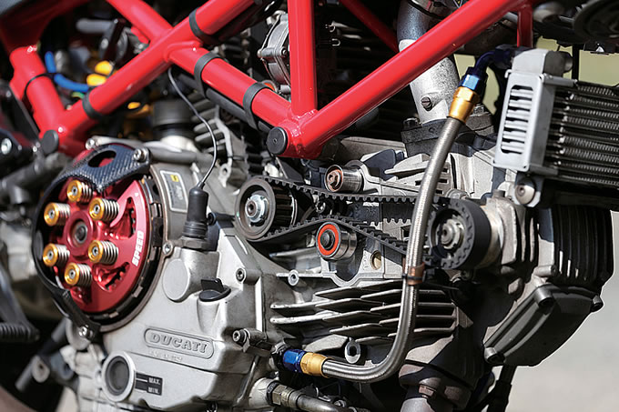 タイミングベルトのカバーを撤去する手法はドゥカティカスタムの定番。メカメカしさがたまらない。