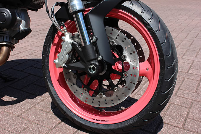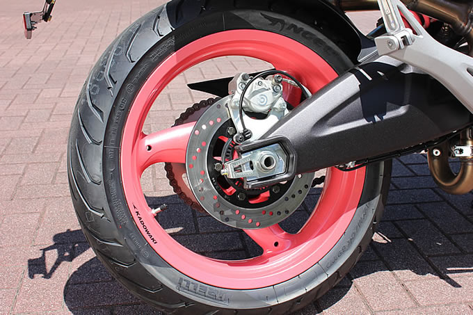 今回、爽やかなピンク色にペイントが施されたのは、前後ホイールとリアサスペンションスプリングのみ。ペイントのカドワキコーティングによる粉体焼付け塗装だ。このように比較的ローコストで交換できる部分を塗装することで、気軽にカラーチェンジを楽しめる。同時に、排出ガスや騒音などの各種規制が厳しい昨今では大きなカスタマイズを行うと法令を順守できなくなる恐れもある中で、カスタムペイントは現実的で魅力的なローリスクカスタムとも言えるだろう。