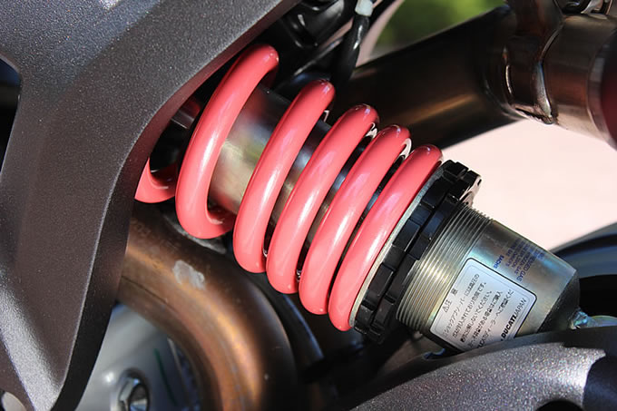 このモンスター696 は新車をベースに、前後ホイールとリアサスペンションスプリングをピンクに塗装したディーラーデモ車両だ。モンスター696、モンスター796、モンスター1100/S、モンスター1100EVO には純正オプションで着せ替え外装(これらのモデルはガソリンタンクがもともと樹脂カバーで覆われている)が存在するように、カスタムペイントとしてはガソリンタンクやカウル類を好みのカラーリングに変更するのが一般的、かつリーズナブル。そんな中、あえてホイールとサスペンションスプリングといった機能パーツを塗装するのは、正規ディーラーならではの “ユーザーへの提案” という意味が大きい。