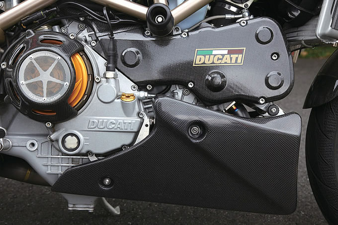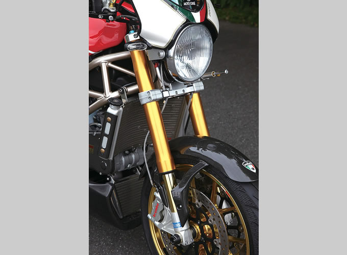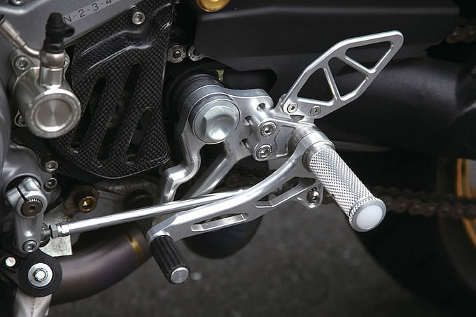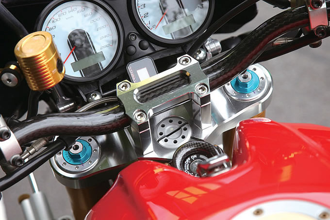 前オーナーが手間と時間をかけて選りすぐったパーツを装着したフルカスタムで、手を加えられていないのはエンジン内部と前後サスペンションくらいなもので、フレームにもマグネシウムカラー独特の輝きを維持すべく、コーティング処理がされている。また各部に奢られるパーツには、モトコルセ、アエラ、ライディングハウスといった国内屈指のブランドがチョイスされ、そこにライダースクラブのオリジナルパーツがアクセントを与えている。