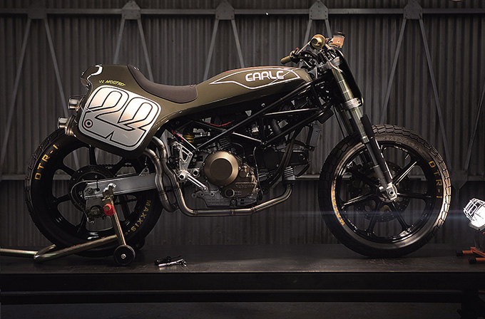 アレックス・アール氏が率いるアール・モーターが手がけた“ドゥカティ・トラッカー”もその1台だ。ベース車両はモンスターM900。もっとも特徴的なのは、タンク・シート・ゼッケンカウルをワンピース構造とした点だ。こうした外装はフラットトラックでは古くから用いられているが、アール・モーターではスチール・トレリスフレームとの相性を検討するために、実車に取りかかる前にミニチュアを製作して、丹念にモデリングを行ったほどのこだわりよう。