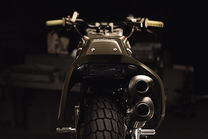 コンセプト段階では1/5スケールのミニチュアを製作、全体的なフォルムを検討した。その後、車体各部を3Dスキャニングでデータ化、その数値を元に外装の寸法を決定した。マフラーは右サイド2本出しでゼッケン裏に収まる。ホイールは前後とも19インチでフロントはカワサキ空冷Z用、リアはハーレー用を流用し、タイヤはフラットトラック用をチョイスする。スタイリングの肝となる外装はファイバーのワンピース。タンクは容量3ガロンのアルミ製インナータンクを別途製作している。