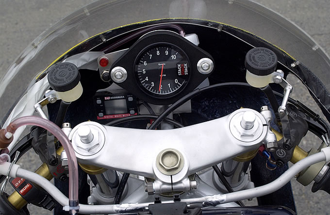 クラシックな年式に入りつつあるF1だが、メーターはモダンなスタック製を装着。フルスケール10000rpmでは振り切ってしまったので、レース後13000rpmのものに交換した。