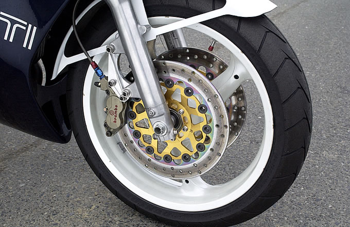 フロントフォークは86年式(ぐらい)のTZ250用を、トップブリッジ、三ツ又とともに流用。インナーチューブにはアダプターをかませて延長してある。鋳鉄ローターなどブレーキ周りもTZベース。