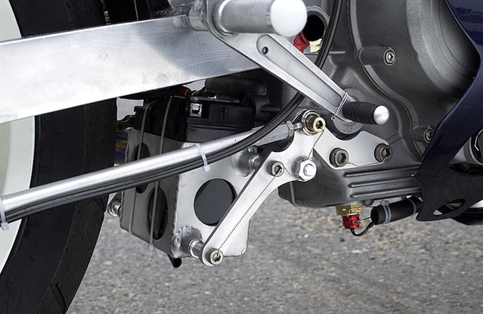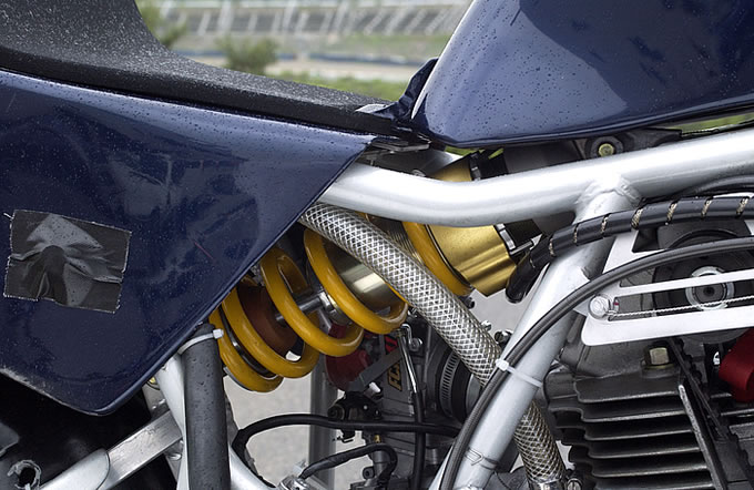 リアサスはオーリンズ製。チラリと見えるシートカウルはメーカー、ブランドとも不詳だが、燃料タンクはI型純正のアルミ製。