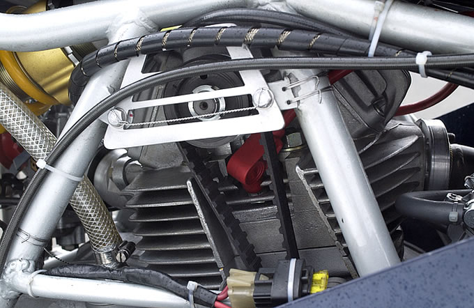 タイミングベルトのループの隙間にツインプラグ用のプラグキャップが見える。ベルトスプロケットカバーは中川さんお手製だが、あまりお気に入りではない様子。