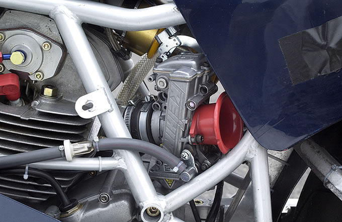 キャブは FCR Ф41。フロント側は燃料コックとの干渉、リアはインマニのショート化などの追加工を行なった。