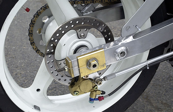 リアホイールにもTZ250用パーツを流用。ホイールサイズはF3.50-17、R4.75-17。
