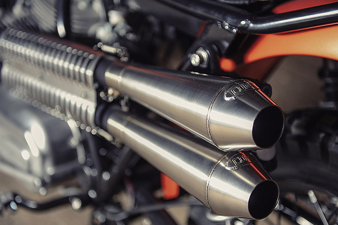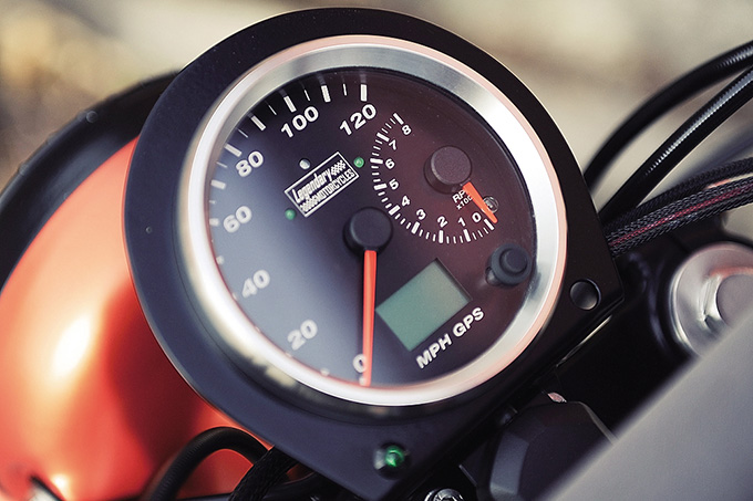 現代的な感覚で乗れる1台を、というオーナーの希望もあり、メーターにはLegendary MotorcyclesのGPS式、リアサスにはFOXの最新型と今時のパーツも投入。フォークは90年代のトラ・タイガー用を流用し、Fホイールは19インチ。組み合わせるローターはCB550用を加工している。リアキャリアやワイドフットペグはマシニングによる削り出し品である。ワンオフのアルミタンクは、オリジナルへのリスペクトを感じるデザイン。リバースコーン型のサイレンサーはCone Eng.製でビンテージ感を演出する。
